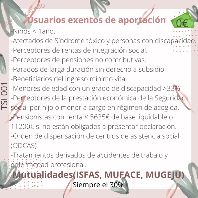 Existen usuarios exentos de aportación en la seguridad social, tiene TSI 001 y no pagan medicinas, son los siguiente grupos: