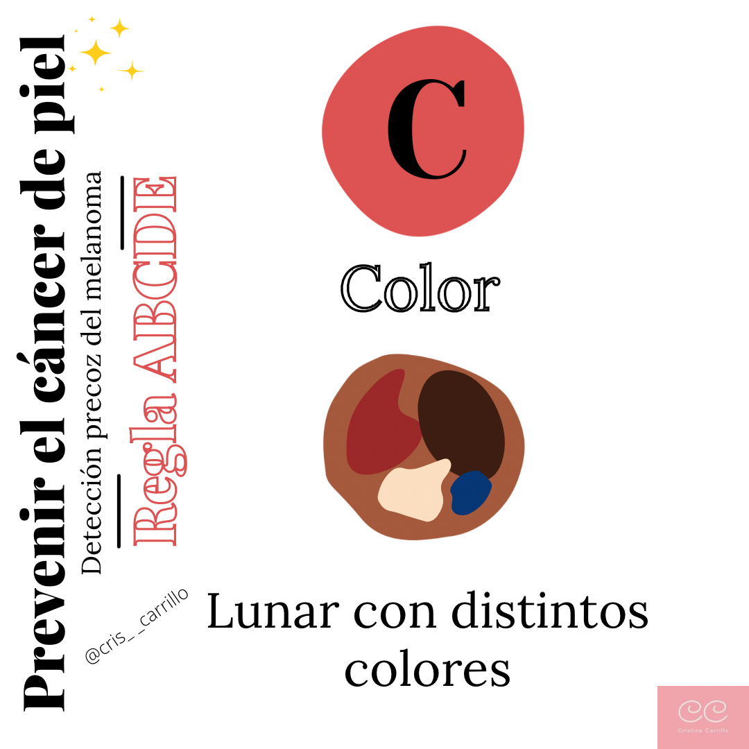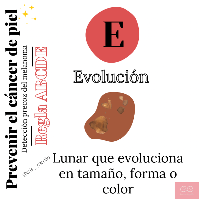 Y por último, E evolución. Cualquier lunar que evolucione mucho en tamaño, forma o color, en comparación con antes, debe valorarlo un especialista.