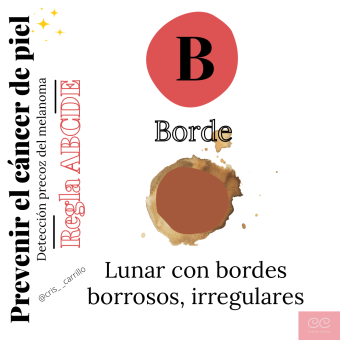 B, bordes. Los lunares con bordes borrosos, irregulares o difusos, también deben ser objeto de estudio.