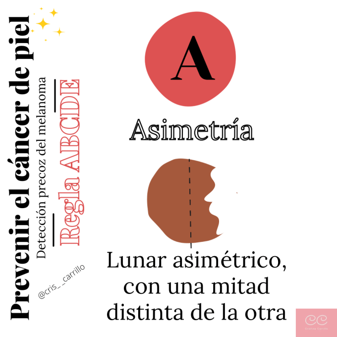 A, asimetría. Se buscan lunares asimétricos, con una mitad distinta de la otra.