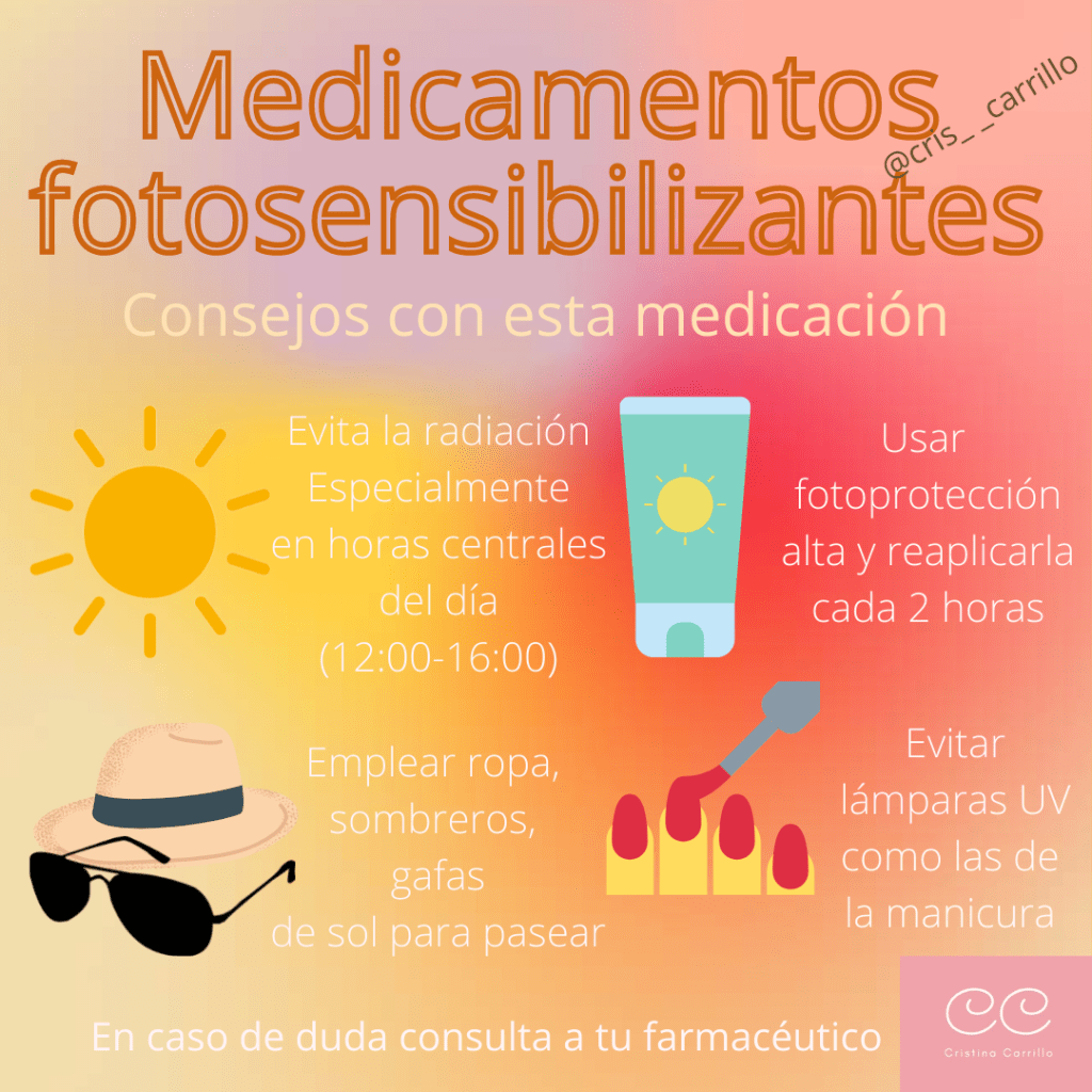 Con la llegada del buen tiempo a veces es inevitable la exposición al sol. Además de los peligros por el envejecimiento y el cáncer de piel, tenemos que tener especial cuidado si tomamos alguna medicación, ya que está puede ser fotosensibilizante y por tanto, reaccionar con la radiación solar.