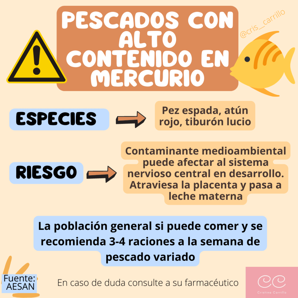 En esta población, en cambio, se recomienda tomar especies con bajo y medio contenido en mercurio. Se recomienda tomar, variando de especies, hasta 3 o 4 raciones de pescado a la semana.