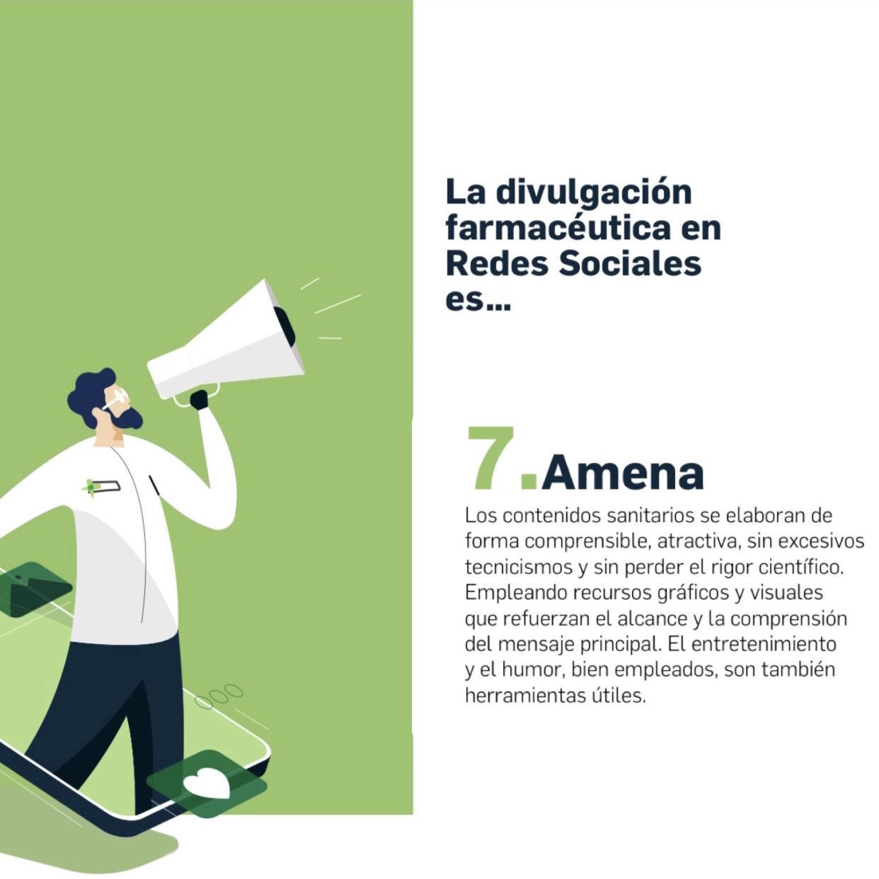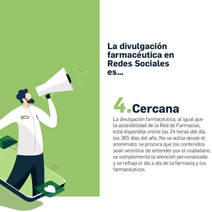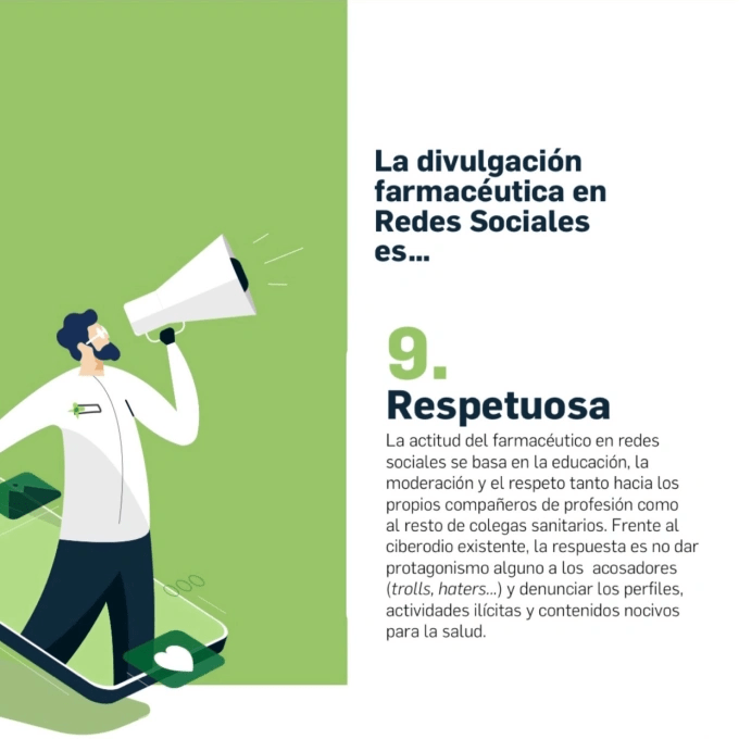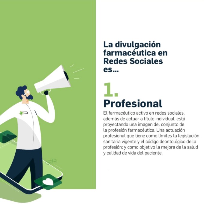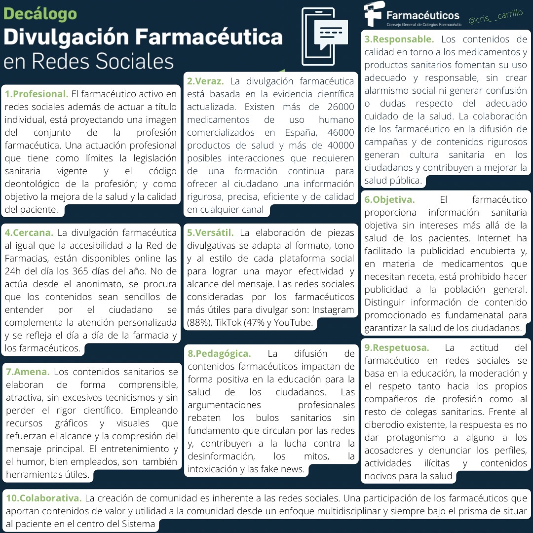 Una divulgación farmacéutica en Redes Sociales que es profesional, veraz, responsable, cercana, versátil, objetiva, amena, pedagógica, respetuosa y colaborativa. hacer hincapié en que «ante cualquier duda sobre el medicamento, tanto si es en el mundo físico como virtual, debe consultarse siempre al farmacéutico”