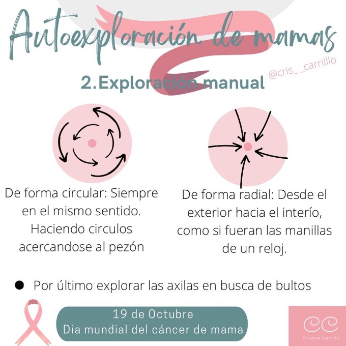Posteriormente pasamos a la exploración manual, se puede realizar tumbada en la cama o de pie, con una mano en la nuca y con la mano libre se examina el pecho contrario. Siempre con los dedos índice, corazón y anular, los tres dedos centrales. Primero se realiza una pasada de forma suave y luego de manera más profunda buscando anomalías.