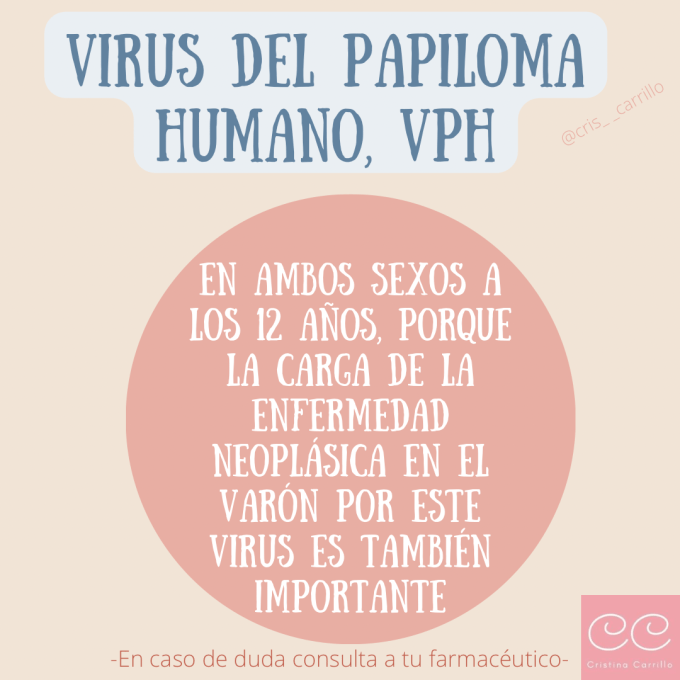 Virus del papiloma humano en ambos sexos a los 12 años, con una separación de 6 meses entre ambas. Porque la carga de la enfermedad neoplásica en el varón por este virus es también importante. Con preferencia de la VPH9 sobre la VPH2, que solo tiene datos de inmunogenicidad.