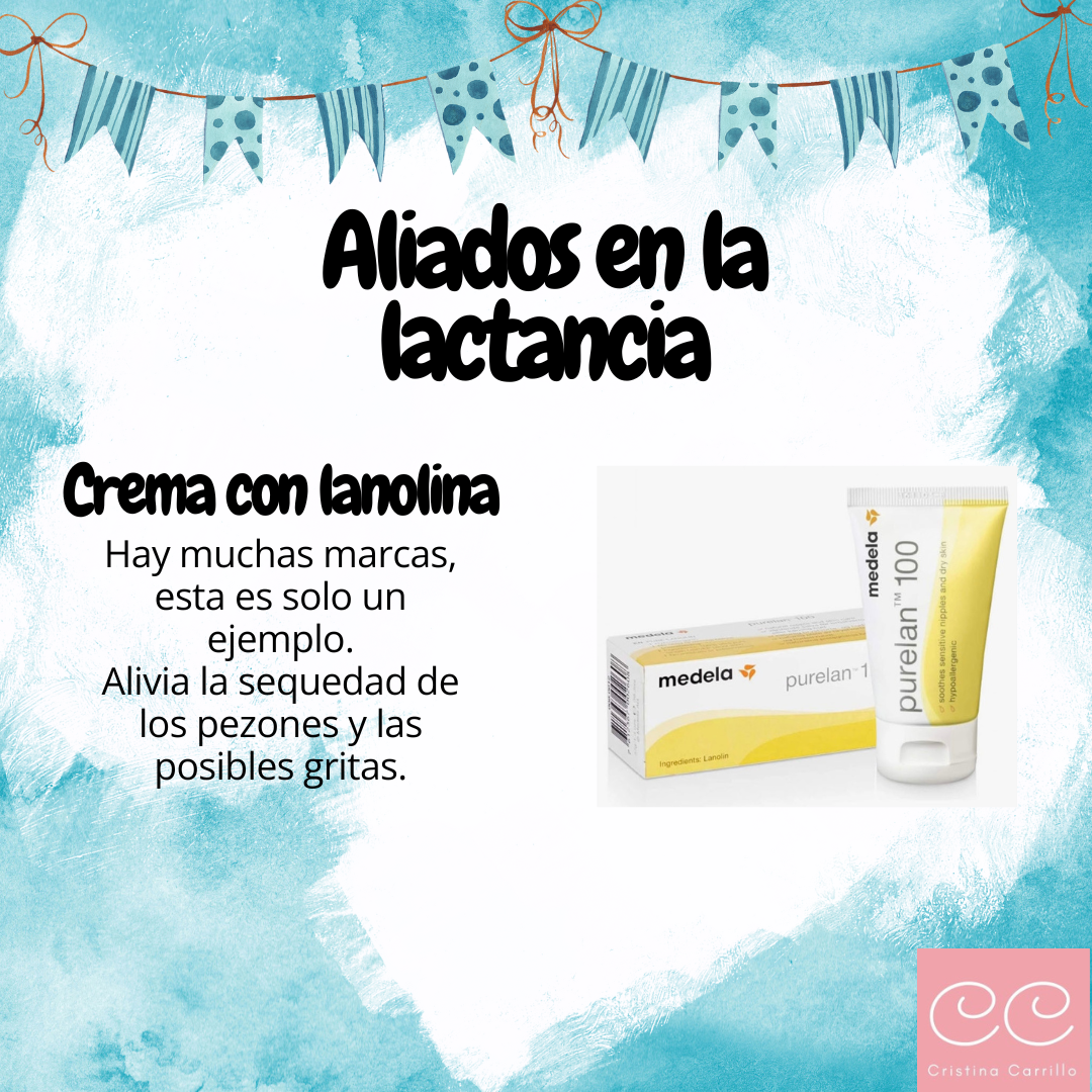 Crema con lanolina. Existen muchas marcas, pongo esta por que es la más conocida, ojo, que no digo que sea la mejor. Ayuda a aliviar la sequedad y las posibles grietas en el pezón. Además no es necesario retirarla o limpiar la zona entre toma y toma. También se puede usar un poco de leche materna de la misma manera.