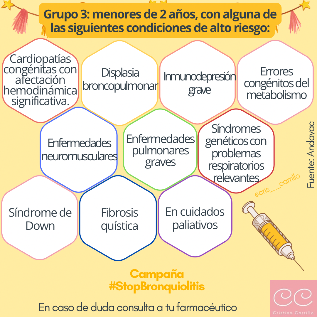 Grupo 3: menores de 2 años con condiciones de alto riesgo. Los padres o tutores legales serán avisados para recibir el fármaco en su hospital de referencia a partir del 25 de septiembre de 2023. Los niños y niñas con síndrome de Down podrán recibir el fármaco en atención primaria.