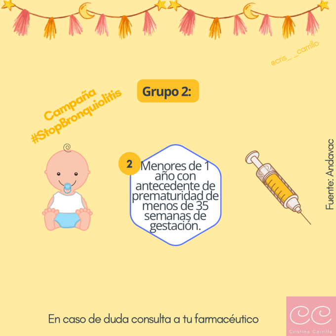 Grupo 2: menores de 1 año con antecedente de prematuridad de menos de 35 semanas de gestación. Los padres o tutores legales serán avisados para recibir el fármaco en atención primaria a partir del 25 de septiembre de 2023.