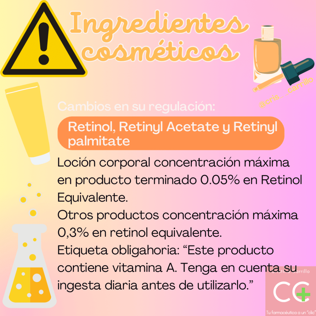Retinol, Retinyl Acetate y Retinyl Palmitate. Loción corporal: concentración máxima en producto terminado 0,05% en Retinol Equivalente. Otros productos que se aclaran y que no se aclaran: concentración máxima autorizada 0,3% en Retinol Equivalente. Cualquier cosmético que lo contenga deberá contener en el etiquetado obligatoriamente, la siguiente mención: “Este producto contiene vitamina A. Tenga en cuenta su ingesta diaria antes de utilizarlo”