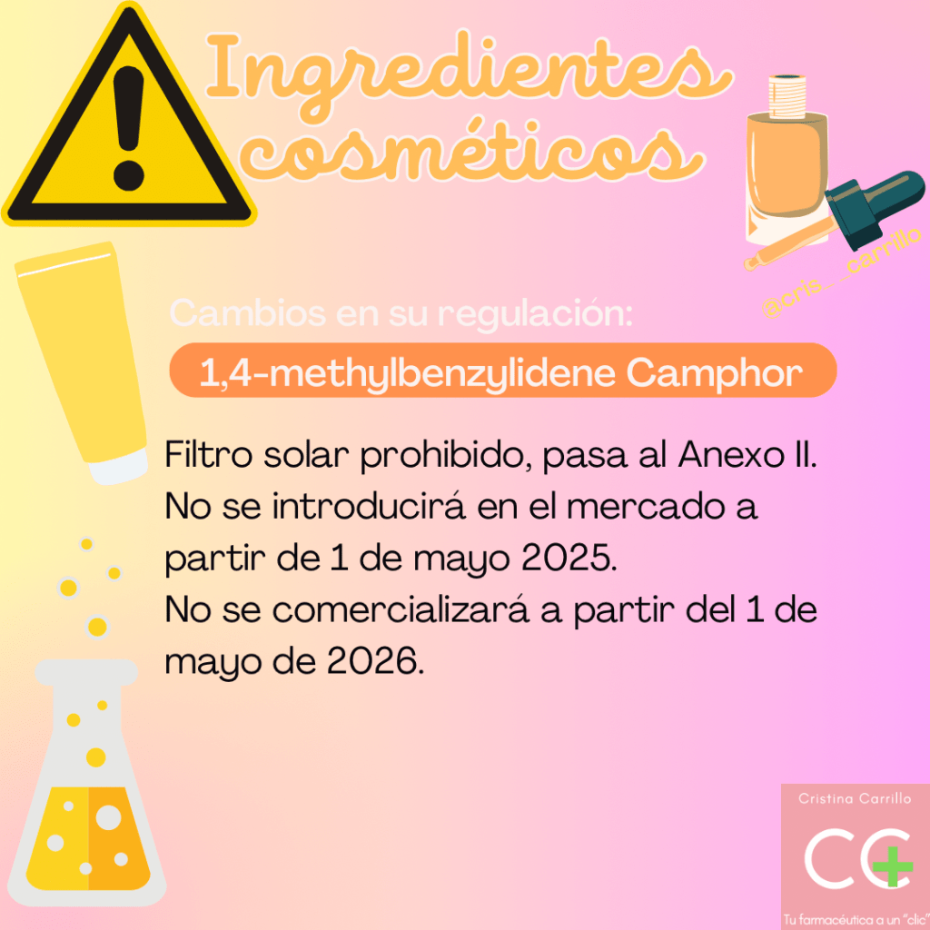 1,4-methylbenzylidene Camphor. Filtro solar prohibido que pasa al Anexo II.