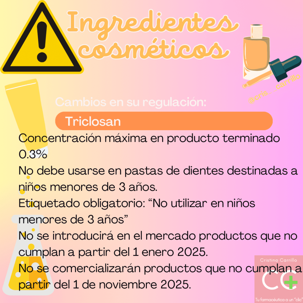 Para los dentífricos que contengan Triclosan, es obligatorio el siguiente etiquetado: «No utilizar para niños menores de 3 años«.