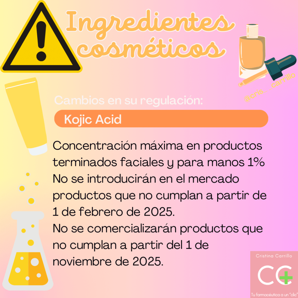 Kojic Acid. Concentración máxima en productos terminados faciales y para manos 1%. No se introducirán en el mercado productos que no cumplan con la restricción a partir del 1 de febrero de 2025. No se comercializarán productos que no cumplan con la restricción a partir del 1 de noviembre de 2025.