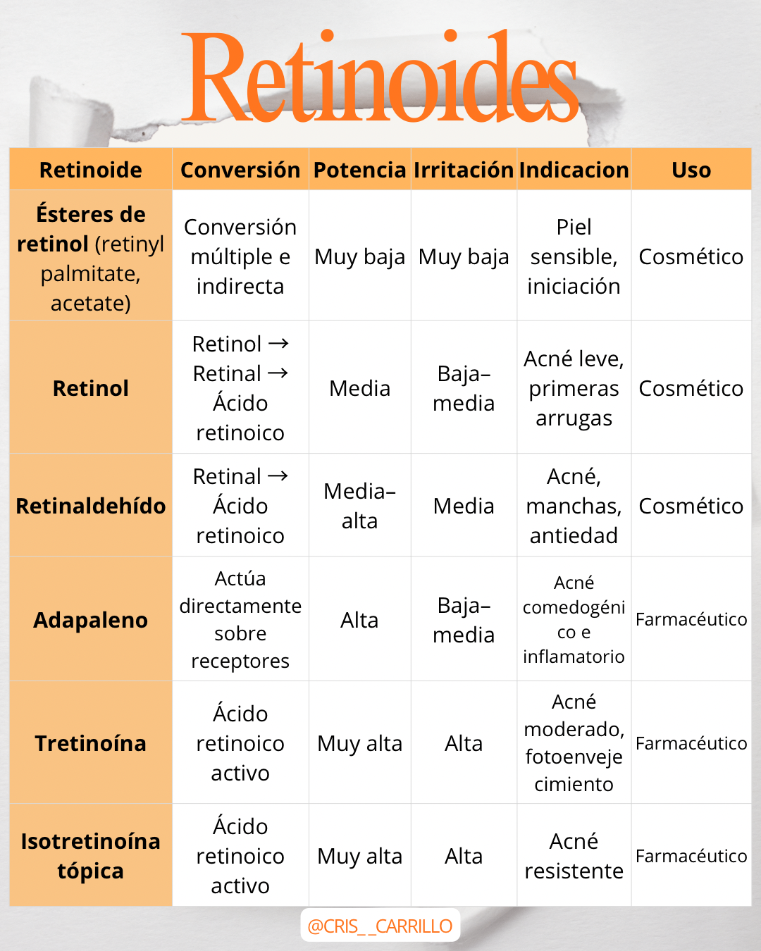Es el retinoide cosmético más conocido. Necesita convertirse primero en retinal y después en ácido retinoico.