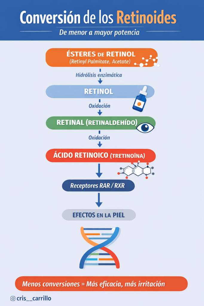Dependiendo del tipo de retinoide, la piel tendrá que convertirlo en ácido retinoico o no, lo que explica las diferencias de potencia, eficacia e irritación entre ellos.